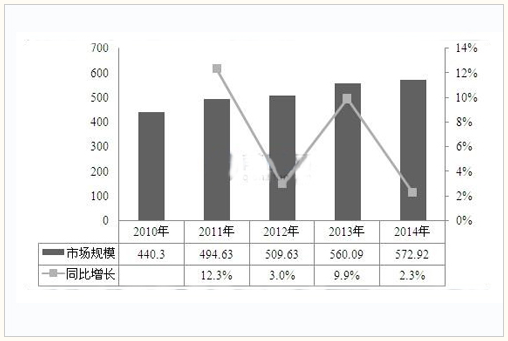 国家统计局统计数据显示,国内传感器市场销售收入在2008年之前均保持20%-30%的高增长,2009年受金融危机影响,国内外需求有所下降,一直销售收入出现负增长,2010年,随着金融危机的影响慢慢淡去,国内传感器市场销售额恢复性增长超过10%。2014年实现销售收入572.92亿元,同比增长2.3%。2016-2021年,受物联网投资以及其它应用领域的强力拉动,传感器市场将出现较大规模的增长。